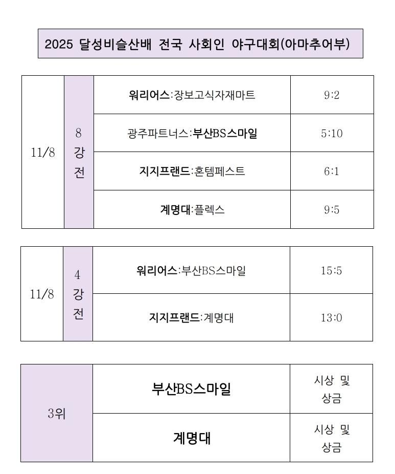 2025 달성비슬산배 전국 사회인 야구대회 [ 아마추어부 ] 8강전 결과